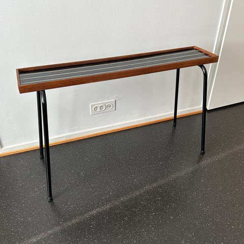 Isomman kukkapöydän tasossa hieman kulumaa mutta jää purkkien alle piiloon