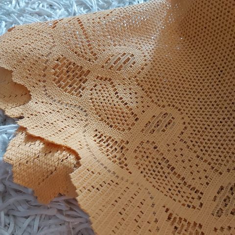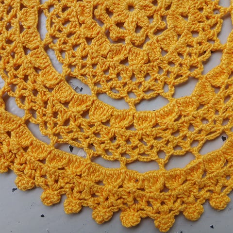 Keltainen käsin virkattu pyöreä pitsiliina. Halkaisija 60 cm.