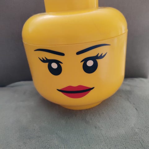 LEGO säilytyspää keltainen. Suuren LEGO-minifiguurin pään muotoinen säilytysastia, soveltuu esimerkiksi pienten lelujen, LEGO-palikoiden tai muiden pientavaroiden säilyttämiseen. Väri on keltainen ja pinnassa on perinteinen LEGO-hahmon kasvokuvio. Muovinen rakenne, kannellinen malli.
