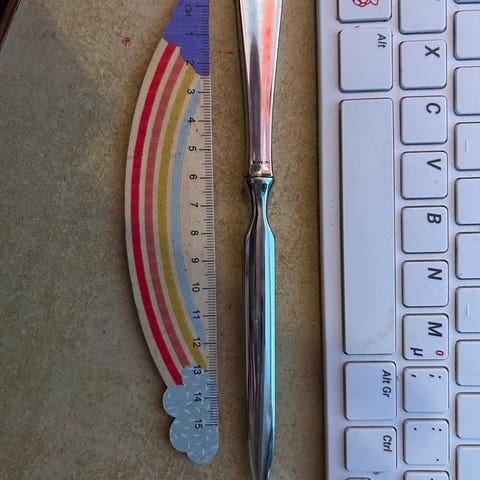 Jotain metallia. Uudenveroinen kirjeveitsi tai ihan vaan koriste. Korkeus 21cm