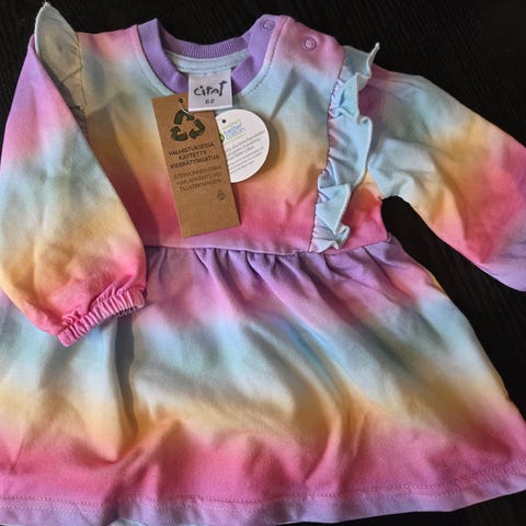 Ciraf vauvan mekko, koko 62. Hihaton malli, jossa vaaleanpunainen pitsipäällinen ja röyhelöinen helma. Edessä koristeellinen nauha ja rusetti, takana napitus. Sopii vauvalle juhla- tai arkipukeutumiseen.