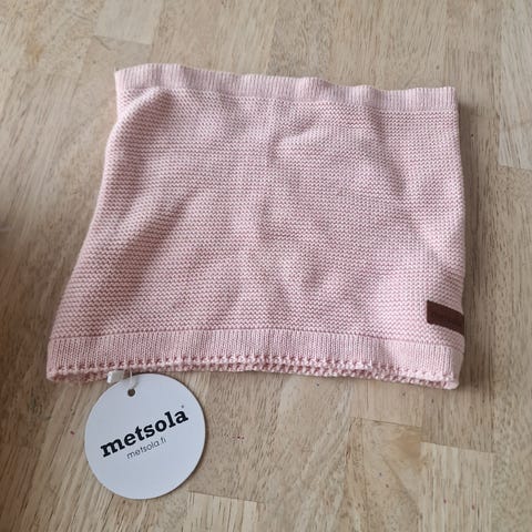 Metsolan one size puuvillainen tuubihuivi. Väri tuollainen meleerattu vaaleanpunainen. Reunoissa voi olla jo sanomista, mutta mielestäni yleisilmeeltään siisti. Hp. 4€
