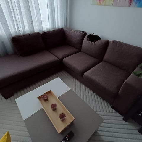 Kulmasohva, jossa ruskea kangasverhoilu ja pehmeä, tuftattu istuin- ja selkäosa. Sohvassa on pyöristetyt käsinojat ja erilliset istuinpehmusteet. Sopii olohuoneeseen useamman istujan käyttöön. Materiaalina on kangas, väri ruskea.