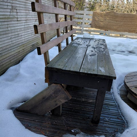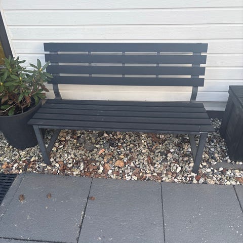Puurtarhakaari (metallia) ja pienehkö penkki. Molemmat puhdistusta vailla.
