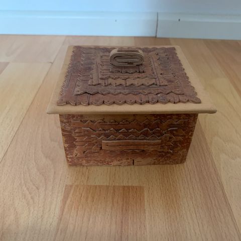 Puinen käsintehty rasia. Halkaisija on 12,5 cm ja kokonaiskorkeus noin 8 cm. Hyväkuntoinen.