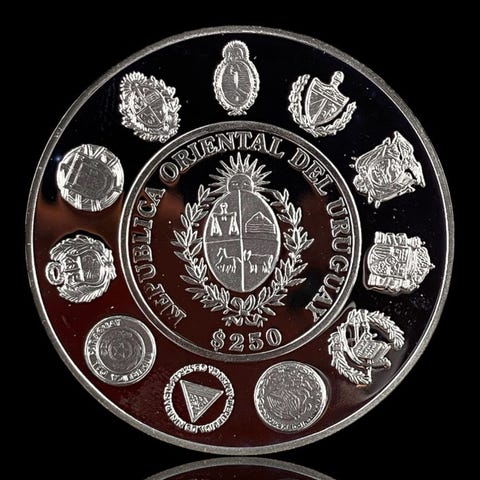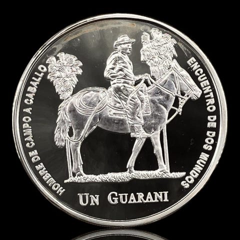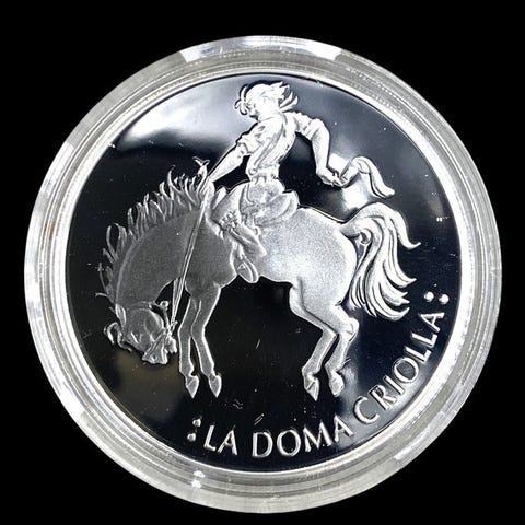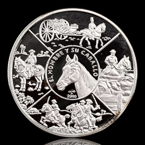 5000 Sucres (ratsastaja)1999Kolikot › Ei kiertoon tarkoitetut kolikot: Iberoamerikkalaiset – Iberoamerikkalainen sarja IV - Mies ja hänen hevosensaHopeaa 925‰ • 27,07 g • ⌀ 40 mmKM# 109, N# 62936