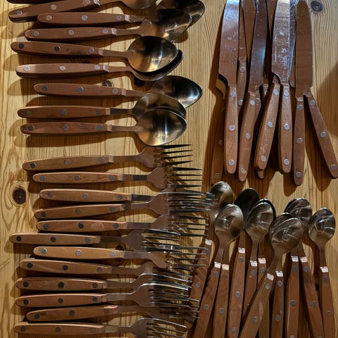 Vain yksi haarukka puuttuu. Osa on käyttämättömiä, osa on vain vähän käytetty.