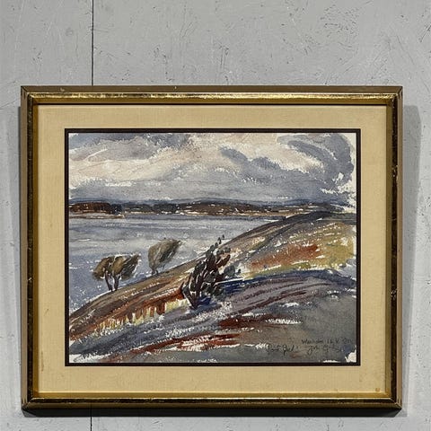 Kehystetty maisemamaalaus, jossa näkyy järvimaisema ja mökki. Maalaus on signeerattu alareunassa U Willgren. Kehys on koristeellinen ja tummasävyinen.