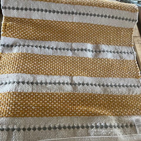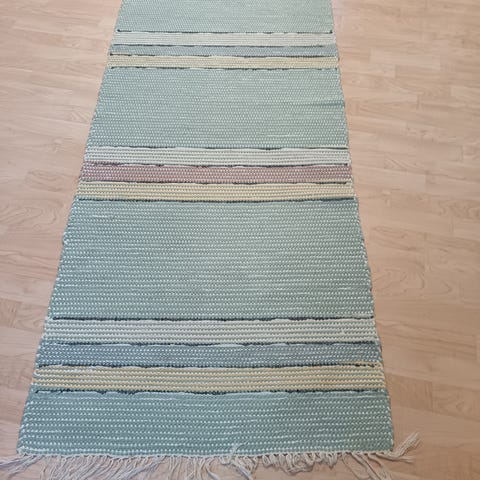 Puuvillainen käytävämatto, jossa vaalea keltainen pohjaväri ja ohuet raidat useissa sävyissä. Matossa on hapsut molemmissa päissä. Sopii käytettäväksi esimerkiksi eteisessä, käytävässä tai keittiössä. Kuvissa näkyy tummentumia toisessa päädyssä siksi näin edullinen. Mitat 170 x 80 cm. Voin lähettää. Mmm.