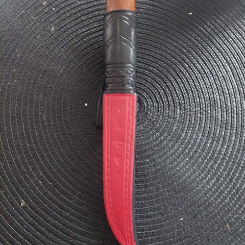 Puukko on hyvässä kunnossa, mutta kotelossa on havaittavissa kulumisen merkkejä tauksessa.