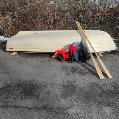 Rihu soutuvene harmaa. Vene on käännettynä rannalla puuston läheisyydessä. Sopii soutamiseen ja lyhyille matkoille suojaisilla vesillä. Materiaalina on teräs, joka tekee veneestä tukevan ja kulutusta kestävän. Väri on vaalea harmaa.