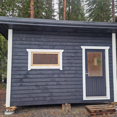 Sauna myydään muuton alta ja nyt siirretty pois nurmialueelta. Tuosta helppo nostaa kyytiin. Paino noin 1200kg.