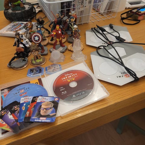 Disney Infinity pelialustat ja hahmopakkauksen figuurit. Pakettiin kuuluu useita Disney Infinity -pelialustoja johdotuksineen sekä useita keräilyfiguureja ja pelilaatoja. Figuurit ja pelilaattapalat on tarkoitettu käytettäväksi Disney Infinity -videopeleissä yhteensopivilla pelikonsoleilla. Kokonaisuus sisältää useita eri hahmoja ja erimuotoisia pelilaattoja, jotka tuovat lisäsisältöä peliin. Tarkka hahmojen ja osien lukumäärä sekä yhteensopivuus eri konsolimallien kanssa kannattaa tarkistaa kuvista ja omien laitteiden vaatimuksista.