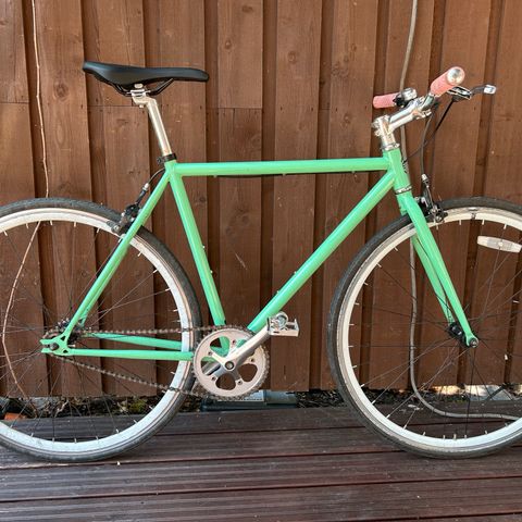 Hurjan kevyt sinkula 59cm runkokoolla (sopinut hyvin 187cm kuskille). FlipFlop hub eli pyörästä saa takapakkaa kääntämällä joko yksivaihteisen sinkulan tai fixed gear pyörän. Runko on Chromoly terästä, jota ilmeisesti käytetään lentokoneissa, koska se on kevyttä ja kestävää. Mene ja tiedä, mutta pyörä on todella kevyt ja ilo ajaa kaupungissa ja vähän pidemmilläkin lenkeillä. Mukana tulee kolme erilaista ohjaustankoa (suora, droppi ja bullhorn), joista nyt asennettuna suora tanko (ks. kuvat). ThickSlick pyörät, joissa vielä hyvin kulutuspintaa jäljellä. Väri on erittäin nopea "Rose" eli jonkinsortin ruusukulta. Taakse on asennettu tee-se-itse tyylillä lokasuoja, jonka saa mukaan halutessaan.