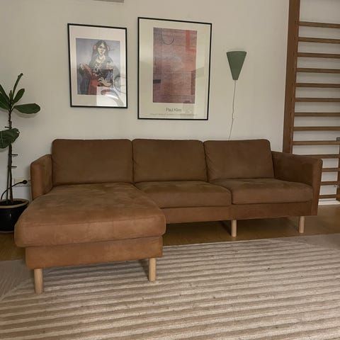 Harmaan sininen kangasverhoiltu kulmadivaani. Viimeisessä kuvassa näkyy väriä paremmin luonnonvalossa. Sohvassa on L-mallinen kulmarakenne, jossa toisella puolella on divaaniosa. Istuin- ja selkätyynyt ovat irrotettavia. Jalustana on puiset, viistot jalat, jotka nostavat sohvan irti lattiasta. L248 S90 ja divaani osan syvyys 220. Ei eläintalaus.