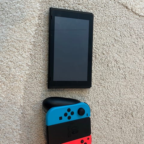 Nintendo Switch -pelikonsoli, jossa neonpunainen ja neonvihreä Joy-Con -ohjain. Mukana telakka, virtajohto ja HDMI-johto kuvien mukaisesti. Lisäksi kuvissa näkyy erillinen ohjain sekä kaksi Nintendo Switch -teräskoteloa peleille. Konsolin asetuksista näkyvät järjestelmätiedot ja tallennustilan määrä. Tarkemmat tekniset tiedot, kuten sisäinen tallennustila ja mahdollinen muistikortti, kannattaa varmistaa konsolin järjestelmäasetuksista. Soveltuu sekä käsikonsolikäyttöön että telakan kautta televisioon liitettynä.