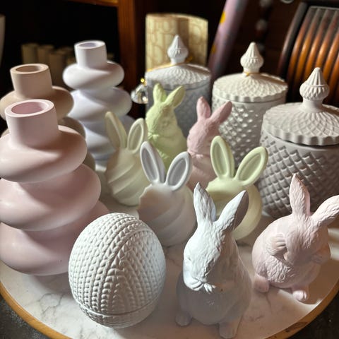 Valkoinen pupu: pituus n. 9,5 cm, leveys enimmillään n. 6,2 cm ja korkeus n. 6,5 cm. Hinta 2 e.