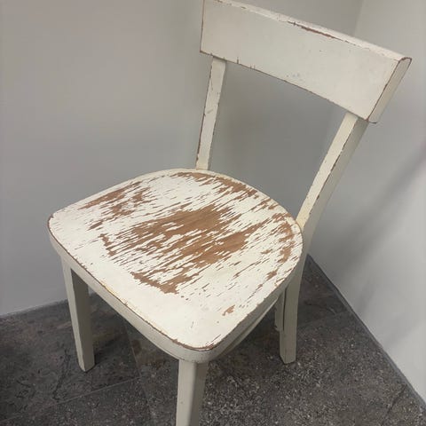 Maalaisromanttinen kaunis tuoli, kauniita yksityiskohtia. Harmaa ja kehykset valkoiset. Istuinosan korkeus maasta 44cm