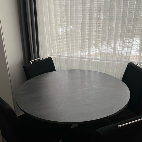 Myydään kiiltäväpintainen valkoinen pyöreä ruokapöytä, jossa tyylikäs trumpettijalka. 4 valkoista ruokapöydän tuolia.