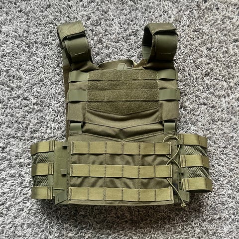 Yk-komennuksen läpikäynyt taktinen liivi, chest rig, veriryhmä merkinnöin, lukuisia taskuja yms.