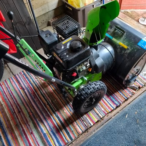 Tämä on sen ikäluokan kampe, että on vielä tehty teräksestä, eikä muovista. Yllättävän hyvin jaksaa heittää märkääkin lunta! Itse vetävä malli.