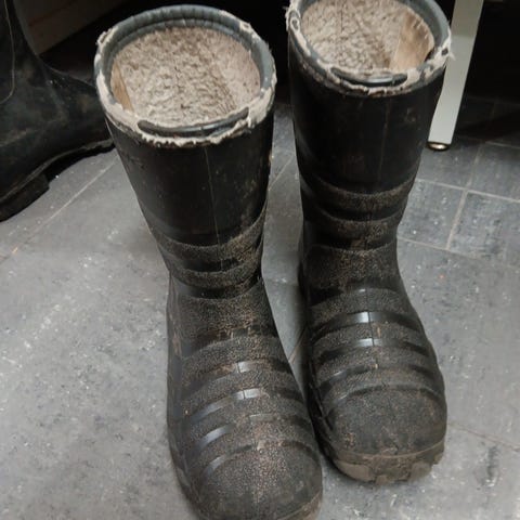 Hyväkuntoiset kumisaappaat, yhdellä lapsella olleet käytössä. Sisällä vuori, nimikoidut. Sisämitta noin 22cm.