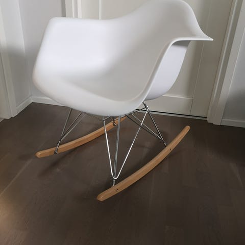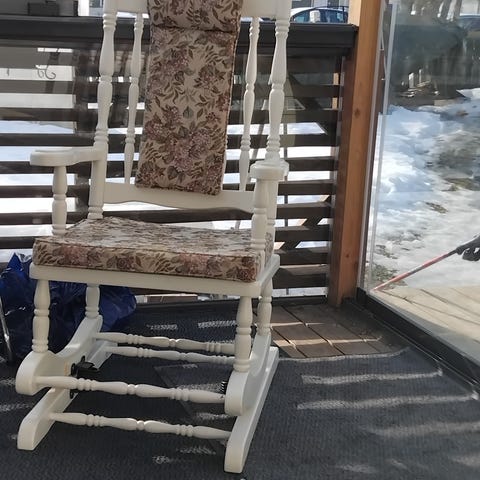 Musta keinutuoli. Maalattu ja liimattu kaikki liitokset uusiksi muutamia vuosia sitten. Samalla laitettu uudet pehmusteet jalkojen alle. Nyt jo hieman käytönjälkeä ja alkaa narista niinkuin keinutuolin kuuluukin.