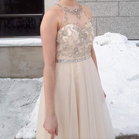 Zazabellan vanhojentanssimekko, koko 34/S. Shampanjan värinen, monikerroksinen helma ja olkaimellinen yläosa jossa koristeelliset helmi- ja paljettikirjailut.