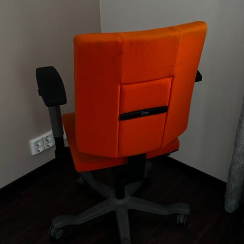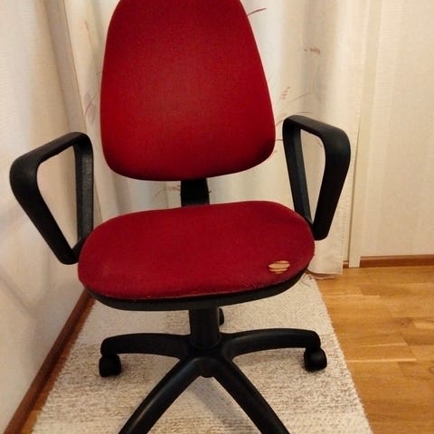 Toimistotuoli. Ulkoisesti kankaassa kulumaa ja takapuoli ei nätein, mutta toimiva ja hyvin rullaava tuoli. Lisämaksusta voidaan kuljettaa kaupunkialueella.