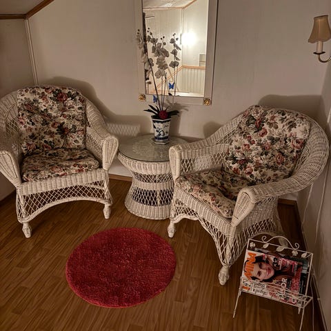 Kaksi tuolia ja pöytä lasikannelle. Hyvässä kunnossa olleet lasitetulla parvekkeella. Saa halutessaan pehmusteet mukaan. Haku Herttoniemestä.