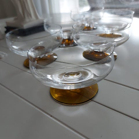 Myynnissä 6 kpl upeaa, hienokuntoista Saara Hopean 1952 suunnittelemaa, Nuutajärven mallin 1344 jälkiruokamaljaa. Ei riksuja eikä naarmuja! Korkeus 8,5 cm ja halkaisija 11 cm. Nuutajärven tarra vain harmaassa yksilössä. Punainen malja on muita n. 1,5 mm matalampi, johtuen hieman erilaisesta jalasta. Siinä on myös kaunis oranssi sävy keskellä (ks. viimeiset kuvat). Lähemmin katsottuna tosin kaikki lasit ovat yksilöitä, kuten taidesineet usein ovat :).