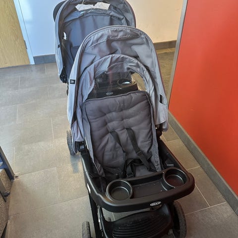 Joie matkarattaat kahdelle lapselle. Rattaissa on peräkkäin sijoitetut istuimet, viisipistevaljaat ja turvakaaret molemmille istuimille. Pehmustetut istuinosat ovat harmaat, ehjät mutta likaiset. Rattaissa on neljä pyörää ja tavarakori alla. Soveltuu kahden eri-ikäisen lapsen kuljettamiseen ja matkusteluun.