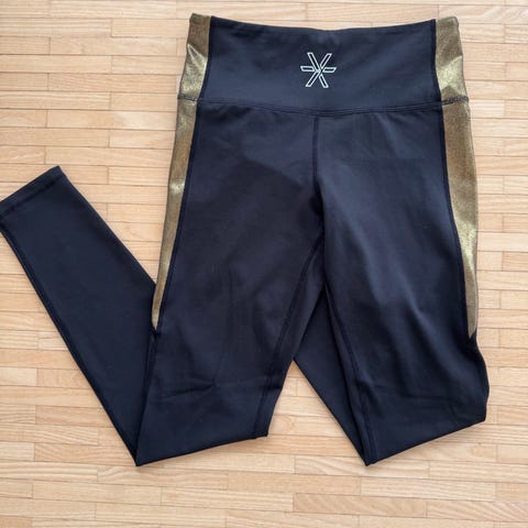 Bara Sportswear treenitrikoot, koko M. Tumma pohjaväri ja vaaleita sekä keltaisia yksityiskohtia. Korkea vyötärökaitale, täyspitkät lahkeet ja reidessä vaaleat raidat. Joustava, tekninen materiaali, joka sopii esimerkiksi kuntosaliharjoitteluun, ryhmäliikuntaan tai muuhun treeniin.