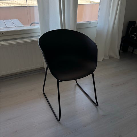 Jysk Aage Petersen -tuoli, musta. Tuolissa on muovinen istuinosa ja metallinen, ristikkomallinen jalusta. Istuinosassa on kiinteä pehmuste, joka lisää istuinmukavuutta. Sopii esimerkiksi ruokapöydän tuoliksi, työpisteelle tai lisäistuimeksi olohuoneeseen.