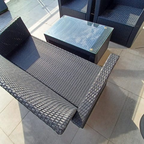 Musta polyrottinkinen terassisohvaryhmä.