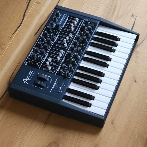 Arturia MicroBrute analoginen syntetisaattori. Kompakti kosketinsoitin, jossa on 25 koskettimen klaviatuuri. Laitteessa on useita säätimiä äänenmuokkaukseen, kuten suotimen, oskillaattorin ja modulaation ohjaimet sekä liukusäätimet ja kytkimet eri parametrien säätöön.