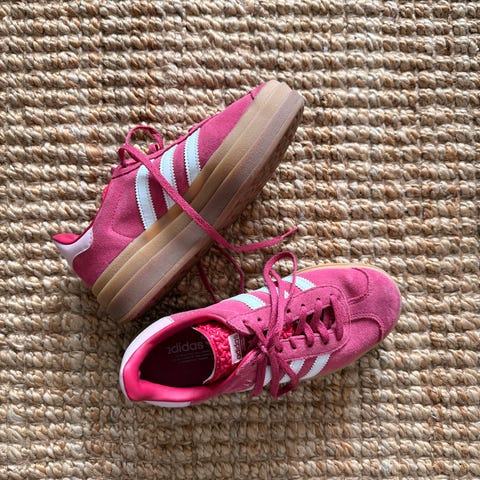 Features a grey suede upper with contrasting white stripes and an off-white or gum sole. Used but in good condition