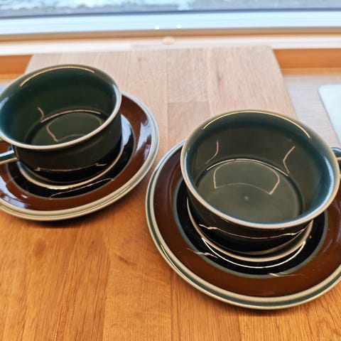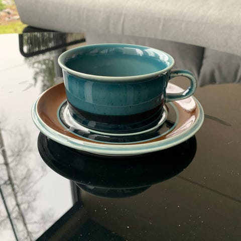 5 kpl Arabian Meri kahvikuppia aluslautasineen. Ehjiä ja hyväkuntoisia. Mukaan saa halutessaan vielä yhden kupin, josta on lohjennut pieni pala reunasta.