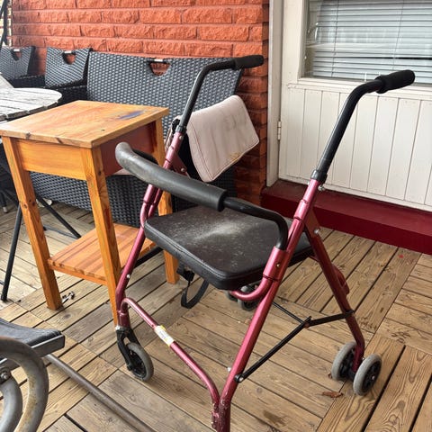 Kiinteärunkoinen rollaattori jossa 2 irroitettavaa tarjotinta.