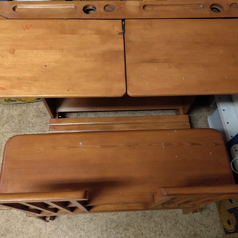 Lasten koulupulpetti kahdelle lapselle. Pöytä ja penkki ovat puuta ja maalattu monivärisiksi (keltainen, punainen ja sininen). Pöydässä on saranoitu kansi, jonka alla säilytystilaa esimerkiksi kirjoille, vihkoille ja piirustusvälineille. Penkki on kiinteästi pöytään yhdistetty ja siinä on selkänoja kahdelle lapselle. Sopii lasten huoneeseen piirtämiseen, läksyjen tekoon ja askarteluun.