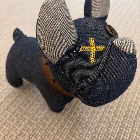 Jack & Jonesin farkkukankainen ranskanbulldoggin pehmolelu.