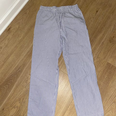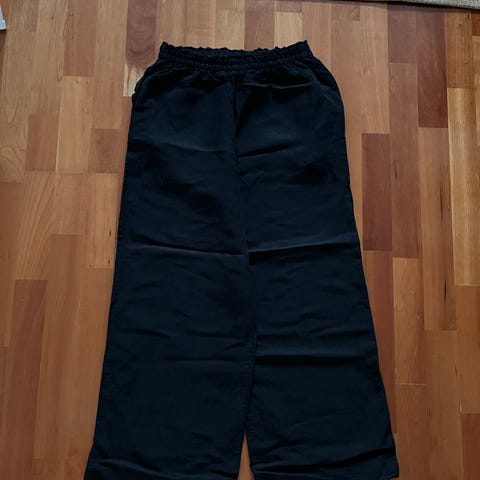 H&M mustat pellavasekoitehousut koossa XS. Vyötärön mitta puolelta toiselle mitattuna n. 31cm. Lahkeiden mitta paras lyhyelle. Olen itse 160cm ja nämä sopivan pituiset. Kiristysnauha ja taskut. Koiratalous, joten karvaa kulkeutuu.