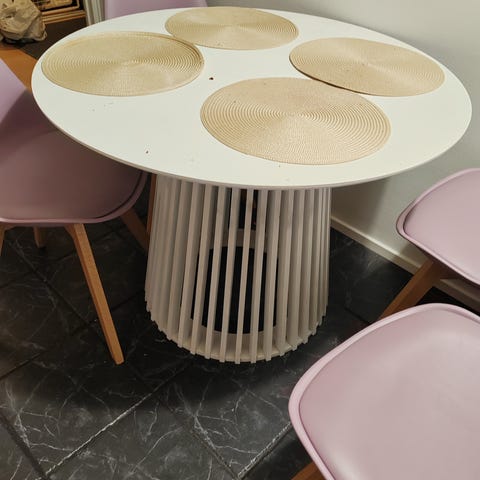 Valkoinen pyöreä ruokapöytä, läpileikkaus 110cm. Pöydän pinnassa, reunoissa ja jaloissa on käytön jälkiä, jotka näkyvät kuvissa. Kosmeettisia vikoja, mutta eivät vaikuta mitenkään käyttöön.