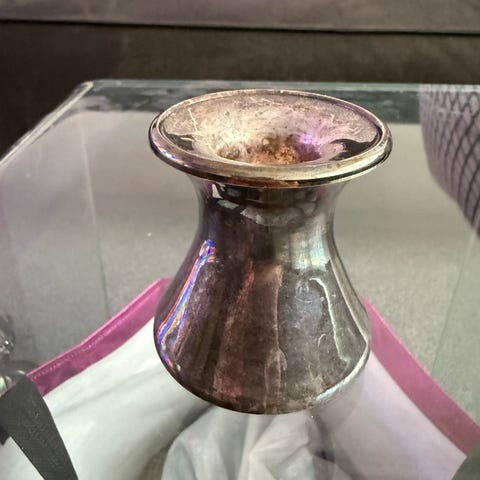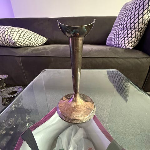 Hopeinen kynttilänjalka, jossa koristeelliset kaiverrukset jalassa ja yläosassa. Esineessä näkyy leimoja, jotka viittaavat hopeapitoisuuteen ja valmistajaan. Pyöreä, leveä jalka antaa hyvän tukevuuden. Kynttilänjalka soveltuu pöytäkynttilälle ja sisustuskäyttöön. Paino kuvassa olevan vaa’an mukaan noin 208 g.