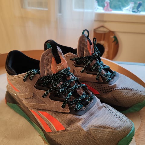 Reebok kengät, koko 38,5, sisämitta 25cm eli aika reilun kokoiset. Soveltuvat juoksuun ja yleiseen liikuntaan.