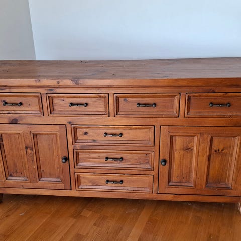 Täyspuinen senkki kolmella vetolaatikolla ja yhtenäin kolmen oven alahyllystö jossa kaksi tasoa.Ostaja kantaa senkin pois,koska on niin painava etten pysty sitä liikuttamaan.Kolmannesta kerroksesta jossa ei ole hissiä.En tiedä mistä ostettu tai merkkiä.Olen itse saanut sen ja ollut käytössä viisi vuotta.Tilava ja kaunis huonekalu,mutta meille liian suuri.
