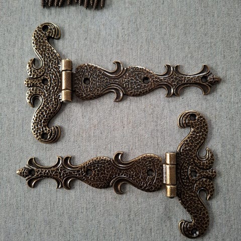Medici saranat samakkivalua 2 kpl. Pituus 9,7 cm, leveys 3,0 cm, leveys avattuna 7,2 cm. Antiikkisävy. Käyttämättömät. Hinta yhteensä.