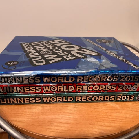 Guinness World Records tietokirjat ja Ripley’s Believe It or Not -kirja. Setissä useita eri vuosikertoja Guinness World Records -kirjoja (mm. 2012, 2015, 2016, 2018, 2019, 2022) sekä Ripley’s Believe It or Not -kirja. Kovakantisia, värikuvitettuja kirjoja, joissa esitellään erilaisia ennätyksiä ja erikoisuuksia. Sopivat luettavaksi kaikenikäisille kiinnostuksen mukaan ja käytettäväksi esimerkiksi yleisen tietämyksen kartuttamiseen tai ajanvietelukemisena.