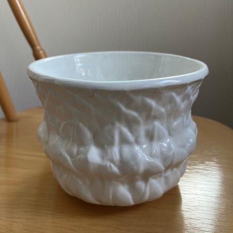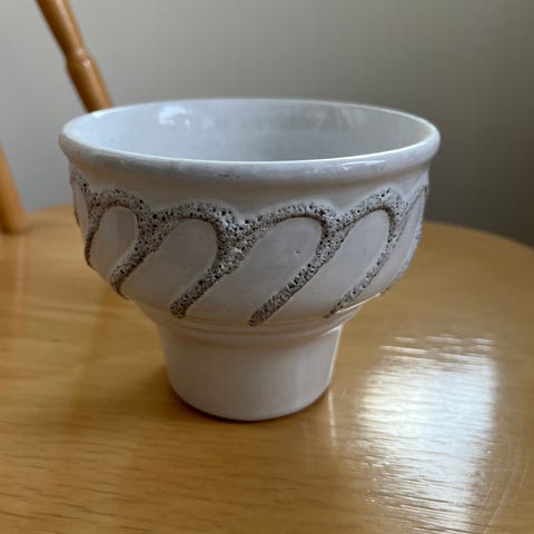 Vanha keraaminen seinälle kiinnitettävä kukkaruukku. Korkeus noin 10,5cm ja halkaisija noin 14cm. Ehjä, toki käytön jälkiä voi olla.