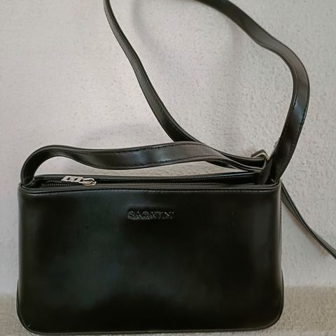 Kaksi erilaista olkalaukkua tekonahasta: musta tikattu laukku ketjuhihnalla ja kääntösoljellisella läpällä sekä pidempi ruskea laukku ketju- ja tekonahkahihnalla ja metallikoristeilla. Sopivat arki- ja juhlakäyttöön naisten asusteiksi. 10,-/ kpl